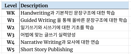 처음 Writing을 배우는 단계에서는 Tablet과 Interactive Notebook을 활용해 올바른 문장구조를 습득시키고 월별 특징을 고려하여 매일 다른 토픽에 대한 일기를 쓰면서 익숙한 문장이 아닌 사고력 향상과 표현력 향상을 도모한다.