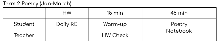Term 2에서는 ‘시’를 이해하고 ‘시’가 학생들에게 심어주는 언어의 리듬감을 경험할 수 있게 해준다. 여러 종류의 시와 Device의 역할에 대해서도 공부하게 된다. ‘시’학습을 하면서 경험할 수 있는 효과 중에 하나가 글을 읽을 때나 말을 할 때 ‘포인트’가 어디에 있는 지, ‘포인트’를 어디에 두어야 할 지 생동감있게 발견하고 표현할 수 있다는 것이다.