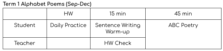 Alphabet을 쓰고 발음하는 연습을 하지만 정확하고 리듬감있게 문장과 어울리게 말하는 것은 연습이 필요하다. RK 레벨에서 알파벳연습은 쉽게 읽을 수 있는 ‘시’를 기본으로 한다. Alphabet의 Character 별로 쓰여진 시를 읽으면서 글자 하나하나를 생동감있게 학습하는 것이 Term 1의 중점교육목표이다.