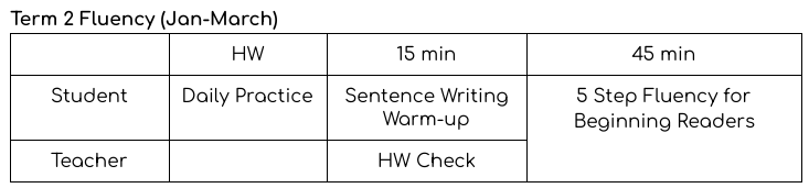 Term 2에서는 5 단계로 이루어 진 Reading Fluency를 향상시키는 방법을 습득하게 된다. Term 1에서 이어오던 Sentence Writing의 난이도는 점점 높아진다.